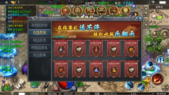1、在线奖励:玩家只需累计在线时长,即可领取在线奖励包含的诸多福利。