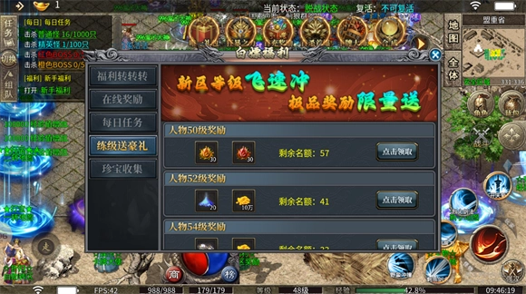 3、冲级赢福利:新开放的服务器大区里,玩家提升等级就能获得奖励,只要达到对应的等级要求即可领取相应福利。