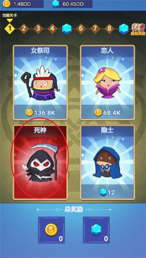 2、从四张牌里随机选一张,只要没选到死神牌,就能获得金币和钻石