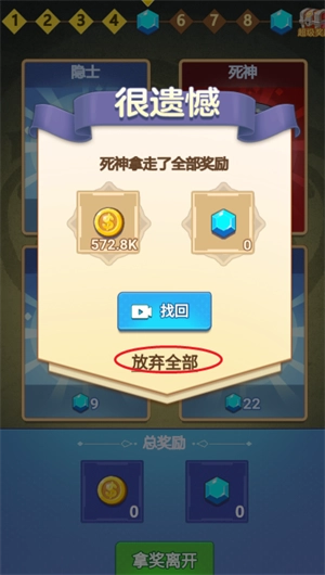 3、要是选到死神,就有可能失去所有收益,这时候观看广告就能把所有收益都找回来。