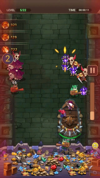 3、屏幕左侧的倒计时用于显示技能与英雄的升级时间,右侧的进度条则代表本关卡的挑战进度