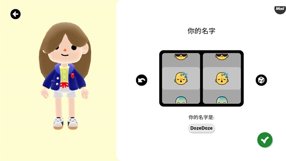 3、创建好角色后可以选择自己的昵称,滑动图标能够更换名称,既可以自行选择也可以随机生成,选好之后点击绿色按钮确认。