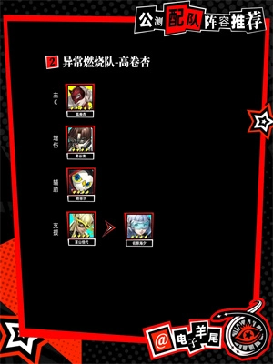 2、异常燃烧队配置:主C选用高卷杏,增伤角色为黑谷清,辅助角色是路菲尔,支援角色可选择富山佳代或佐原海夕。