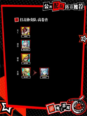1、顶尖战队JOKER队:核心输出:JOKER,辅助位:摩尔加纳(或路菲尔),副输出:李瑶铃(或琴音·蒙塔涅/须见俊也),支援位:佐仓双叶(或富山佳代/佐原海夕)