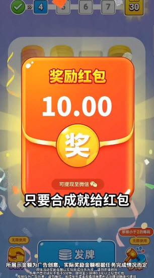 烧脑狂潮是一款休闲益智类的红包小游戏。游戏里玩家得把硬币合成指定数字,才能消除硬币。规则简单明了,把场景中的所有硬币都消除就能通关,完成挑战和观看视频广告都能免费获取红包奖励。