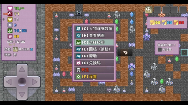 4、点击左上角即可展开菜单,在这里你能够查看自身的数值、技能以及地图信息。