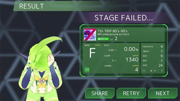 4、正式开始后玩家要把控好节奏点击出现的音符,屏幕上方的进度条代表玩家的血量,一旦漏掉音符血量就会减少。