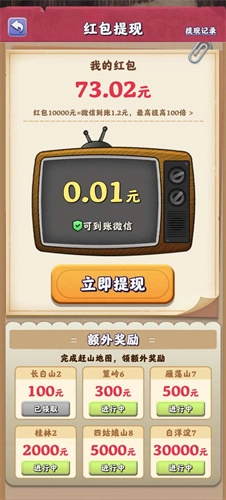 在火眼金睛这个游戏里,玩家扮演赶山人的角色,每日都能进山采集蘑菇、人参之类不同种类的山货,之后就能把这些山货放到集市上售卖,只要有客人下单购买,就能获得不少红包奖励,提现门槛低至0.1元,而且提现后几秒内就能到账。