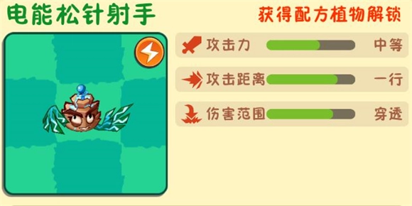 7、电能松针射手:由松针射手与脉冲黄桃合成而来,它发射的子弹能够穿透所在行的全部僵尸。
