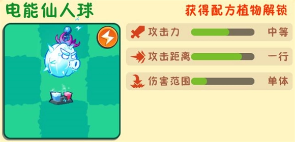 6、电能仙人球:通过仙人球与脉冲黄桃合成可得,该植物能对空中的小型机械僵尸施加短时间的麻痹状态。