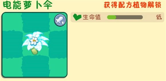 9、电能萝卜伞:由萝卜伞与脉冲黄桃合成而来,被该伞弹开的僵尸会陷入麻痹状态。