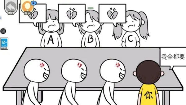 中规中矩的察言观色:上滑主角蹲在椅子上(等情侣脑袋出现黑线),下滑主角坐着,然后左滑主角给情侣让座。