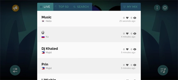2、点击左上角的LIVE按钮,就能浏览到其他用户上传的歌曲,还能查看全球排名前50的作品。