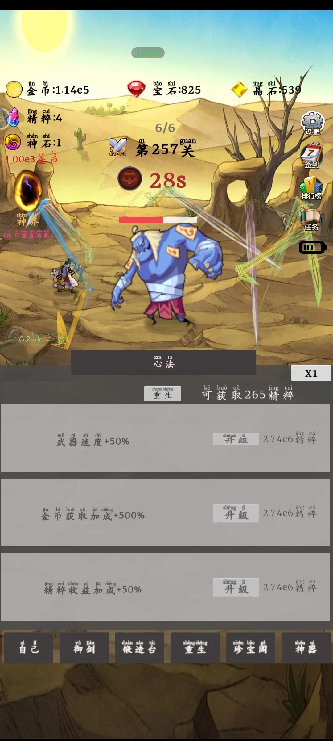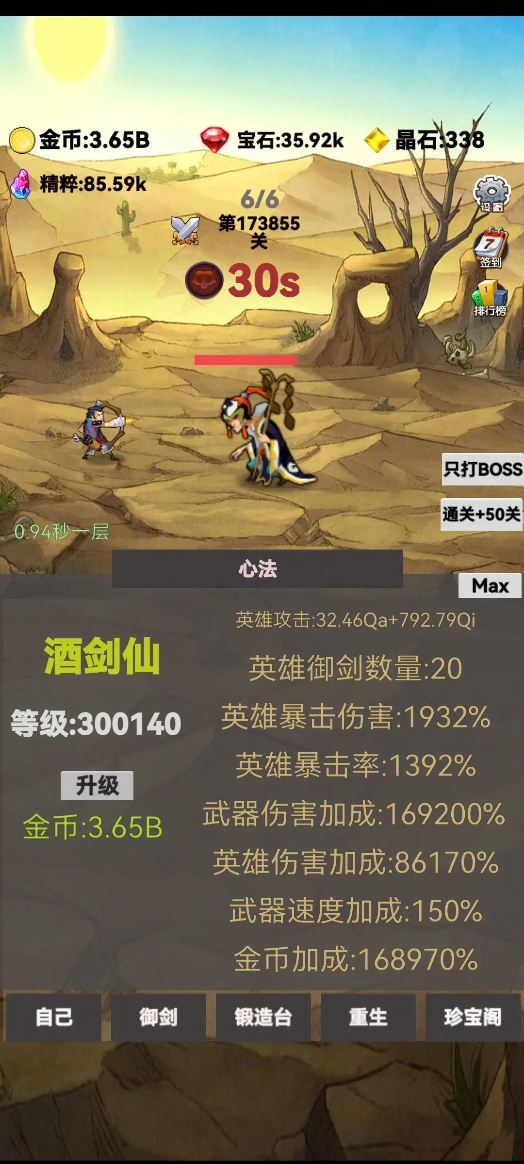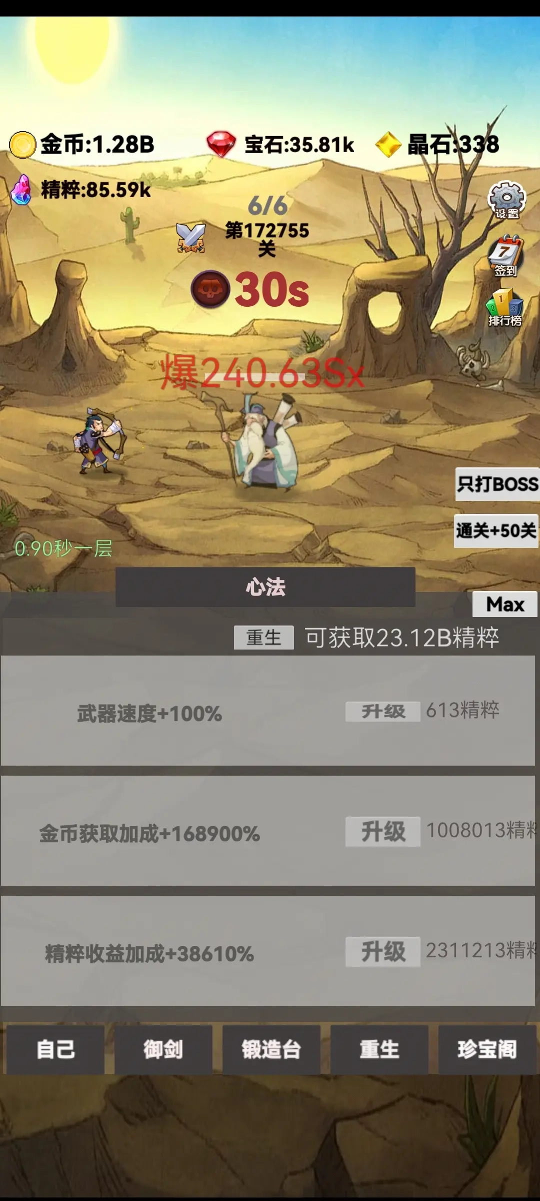 之后便进入了按部就班的平稳发展阶段,通过持续提高精粹收益来积累更多精粹。精粹的提升能带来更高的金币收益以及其他方面的等级增长,大量的金币又会大幅增强人物和武器的伤害。接着,通过不断吞噬最高级武器来获得爆发式的伤害提升,最终实现无限制地推进关卡。