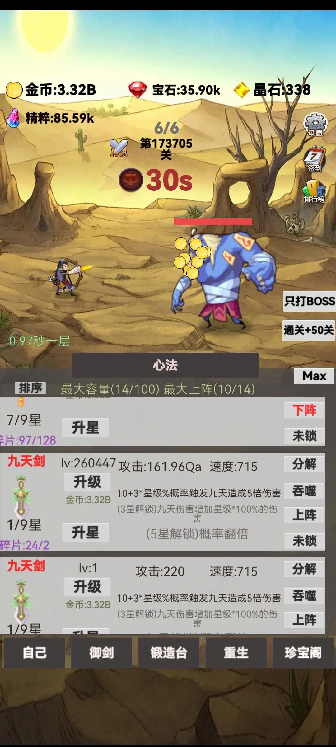 2、通过铸剑提升实力,通过吞噬剑来提升剑的属性。