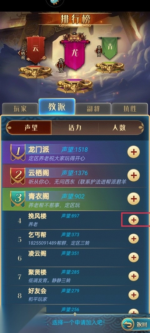 2、教派依据声望、活力、人数这三个维度进行排行,你可以挑选声望值较为合适的教派,接着点击右侧的“+”号加入该教派。