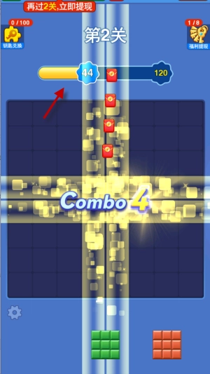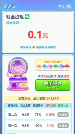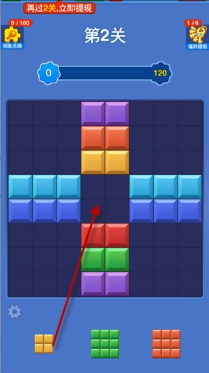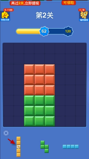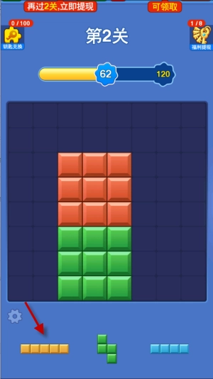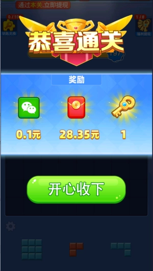 新人刚上线时,跟着教程放置方块就能轻松通过第一关,之后会获得一把钥匙,用这把钥匙可以直接提现0.1元。接下来就需要自己操作了,再轻松通过两关后,就能拿到第二把钥匙,这次能提现0.15元,而且都是秒到账!后续如果还想提现,就得继续闯关获取钥匙才行。