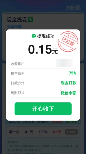 5、通过设定的关卡后能获得一把钥匙,这把钥匙可用于直接提现,这里直接到账了0.15。