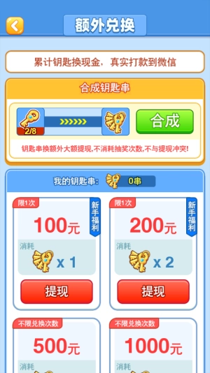 3、参与闯关活动可以收集钥匙,这些钥匙不仅能让你获得提现资格,还能合成钥匙串,赢取额外的大额红包奖励!