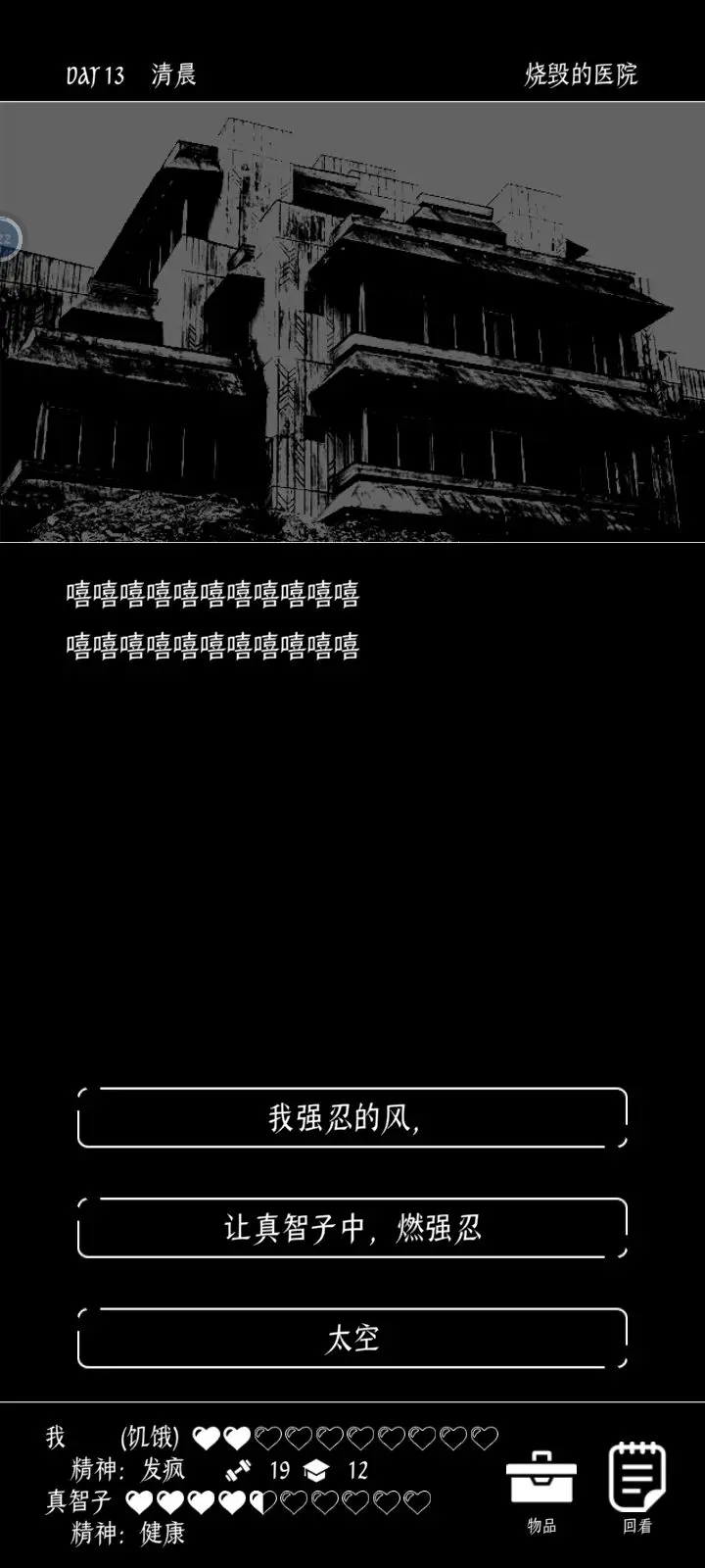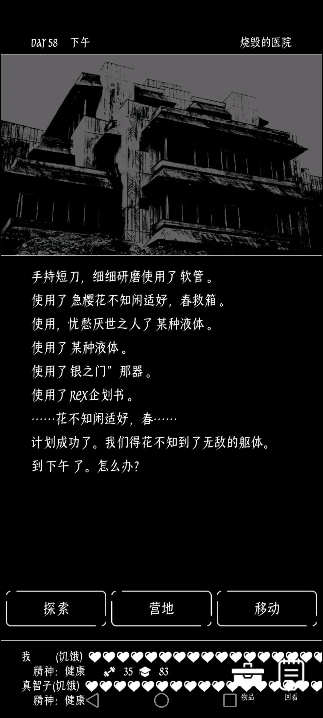 重病状态下有一次机会前往医院,通过选择“治疗”选项进行救治;若缺乏食物,可以去探索图书馆,每次能获得4点食物补充。