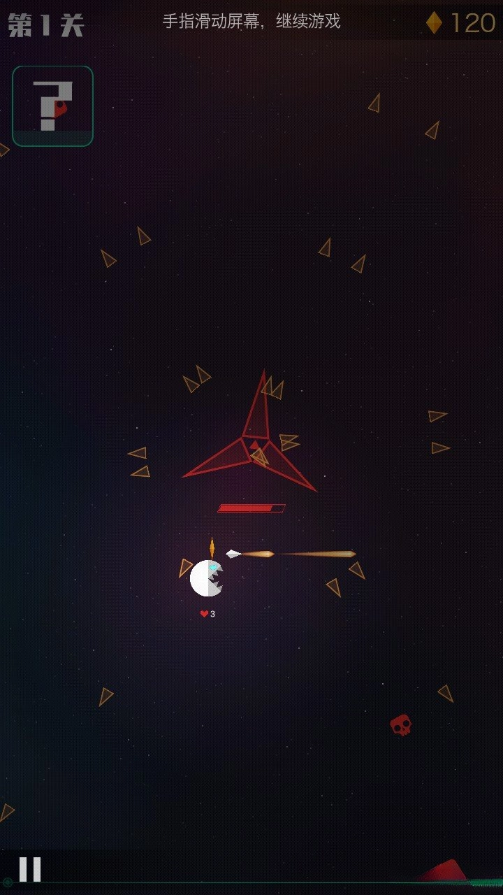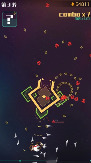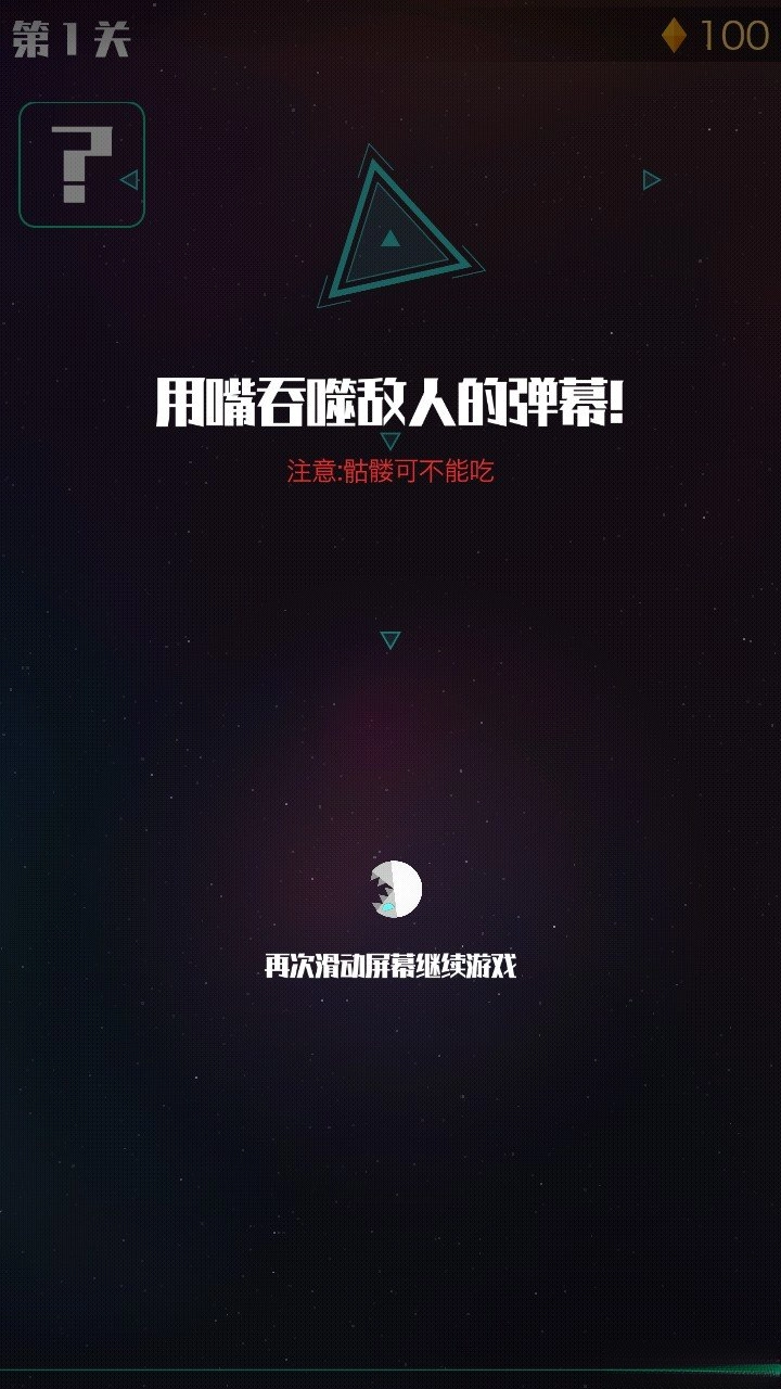 2.可以通过吞噬敌人的弹幕来提升自身实力,但要留意骷髅,也别靠近敌人,不然会损失生命值,你总共只有三条命。