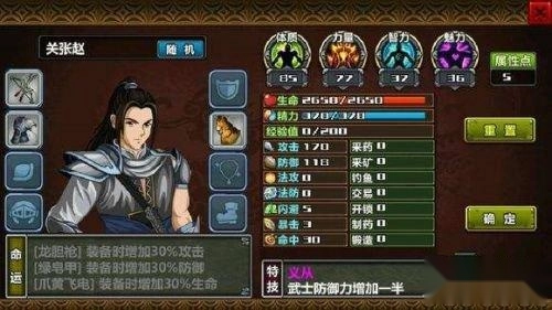6、前期要选好适合自己的主角技能,特技奇才具备自动回蓝的效果;武器建议选青红剑,无论是搭配豪侠、智将还是统帅的定位,都能让攻击提升30%。