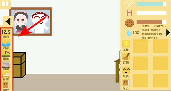 《小春养成记》菜单最新版是一款复古像素风的自由养成游戏,菜单功能为角色养成提供了便捷支持。游戏核心玩法聚焦于五十天的角色培养周期,玩家每天拥有两点行动力,需要合理规划分配,在工作赚钱、打扫卫生、陪伴互动、辅导学习等事项间做好平衡,还要应对三次重要考试。此外,玩家可以探索商业街、服装店等多个不同场景,通过购买道具、钓鱼、种地等途径来调整和优化养成策略,从而解锁更多丰富有趣的互动内容。