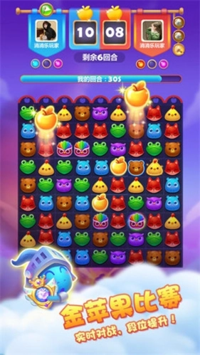 在游戏中,你需要找出三只能够连成一条直线的小动物,通过横向或纵向拖动它们的顺序,让这三只小动物聚集到一起。要留意每一关左上角显示的“过关所需目标”,只有达成这个目标才能顺利通过关卡。比如:某一关要求至少消除10只绿色的小蛙蛙,当你完成这个消除目标,并且得分能够让左下角分数瓶对应的星级指数达到至少1颗星时,就可以成功过关啦!