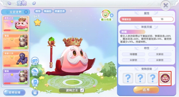 在战斗类宠物的设定里,因为每次仅能让一只宠物出战,所以作为主要出战的那只宠物,在挑选技能时,可优先考虑主动释放类型的技能。拿溜溜猴来说,它属于物理攻击型宠物,其种族天赋具备提升主人暴击能力的效果。