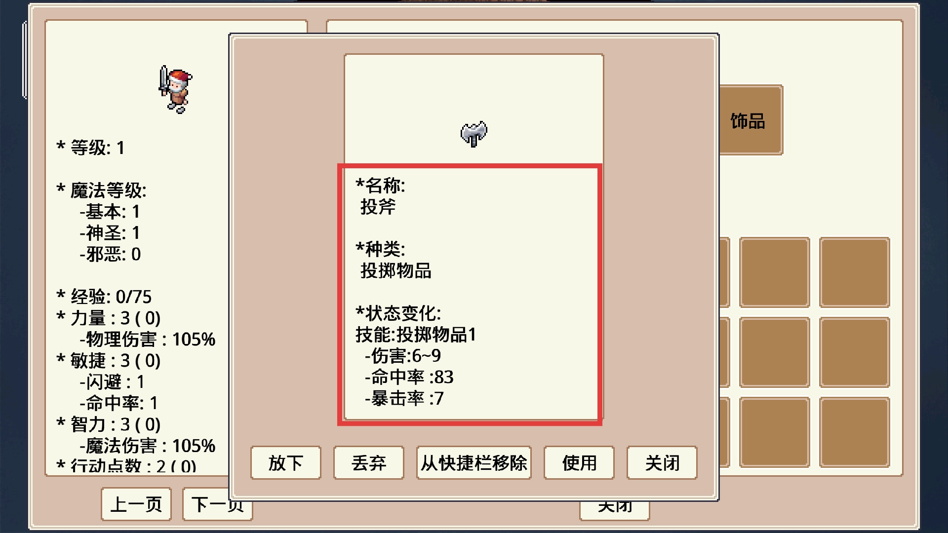 4、使用投掷类物品前建议查看其详情说明,像【投斧】这类道具具备较高的伤害值与命中率,比较适合在需要远距离攻击敌人的场景下使用。