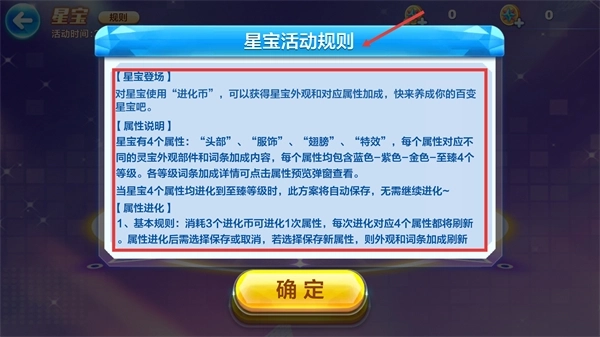 1、消耗【进化币】能够解锁星宝外观并提升其属性,当四个属性均达到至臻品质时,方案将自动留存,期待你打造出千变万化的星宝伙伴。