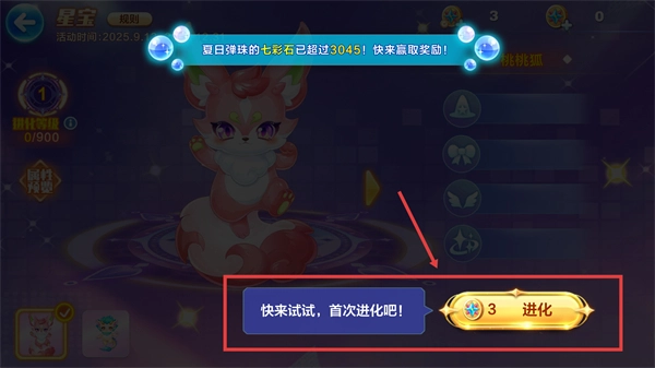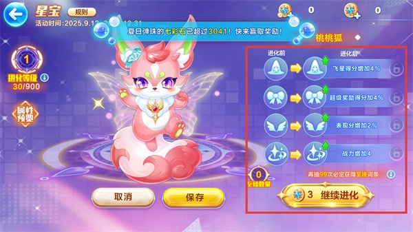 4、星宝进化后属性会得到提升,界面将展示进化前后的属性对比;消耗3个进化币即可继续进化,此外再进行99次抽取就能获得至臻词条。
