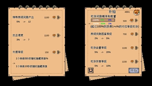 在每一大关开启前,你可以用鸡腿来强化全体英雄的基础属性,而且这些属性加成是永久生效的哦~建议优先把右上角的「吃货奖励概率与数量」点满,这个属性对提升每关结束后三选一英雄的数量和基础品质帮助很大!