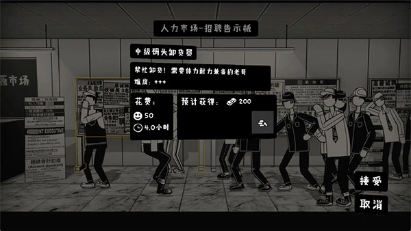 2、玩家得去游戏里的人力市场接各种打工小游戏来做。这些打工小游戏在耗时、难度和给的报酬上都不一样,所以玩家得好好挑一挑。要是去晚了,人力市场里就没什么好的日结工作了。