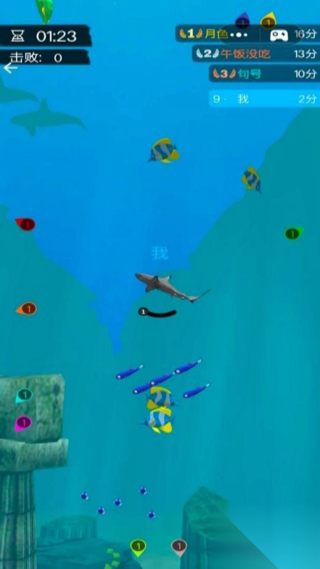 3、多人竞技模式,玩家可操控自己的鱼类与其他玩家的鱼类展开对战,较量策略与操作技巧,角逐海底霸主之位。