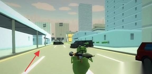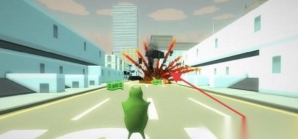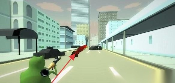 1、控制“绿色青蛙”角色,使用枪械攻击带有红箭头标识的“红色敌人”,在包含建筑与车辆的城市街道场景中,通过精准命中目标来推进关卡进度。