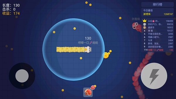 在实际游玩操作中,《贪吃蛇进化论》的玩法机制主要体现在两个方面:其一,玩家借助摇杆来操控贪吃蛇的移动方向,吞食的金币数量越多,贪吃蛇的体型就会变得越大,身体长度也会相应增加;其二,游戏界面右侧设有加速按钮,点击该按钮能够让贪吃蛇在短时间内提升移动速度。