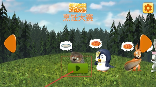 1、进入【玛莎与熊-烹饪大赛】界面后,找到刺猬角色旁边的绿色播放按钮,点击此按钮就能启动对应的烹饪任务流程。
