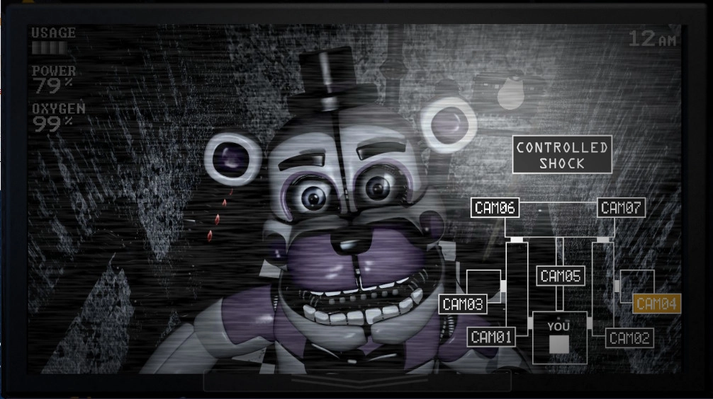 1、欢乐时光弗莱迪(Funtime Freddy):它会在cam03与cam04这两个监控区域之间移动,玩家要迅速关闭对应舱门来回应它的指令。