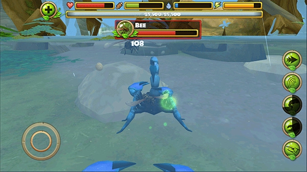 3、在探索过程中,你能够攻击其他动物,像蜻蜓、鸟类、蛇、青蛙等;右侧的按钮从上到下依次为加速、眩晕、尾刺攻击、钳子攻击和吃。