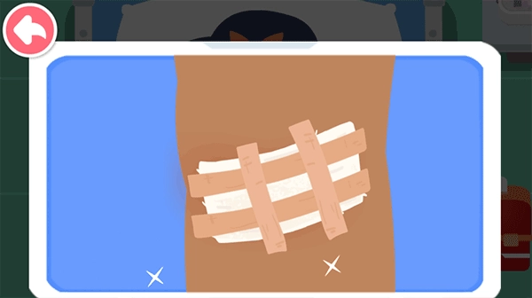 4、病人有颗蛀牙需要拔掉,宝宝来帮忙把蛀牙拔出来。口腔里长了水泡的话,用西瓜霜喷雾喷一下,就能消除水泡、缓解疼痛啦。宝宝们要记住,少吃糖、勤刷牙,这样才能好好保护牙齿和口腔哦!