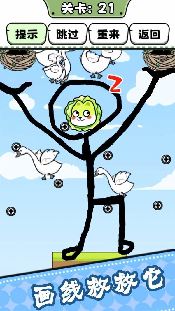 1、玩家得在这儿画线解救菜狗,避开暴躁大鹅的袭击,同时要留意锅盖火箭和碰火枪;