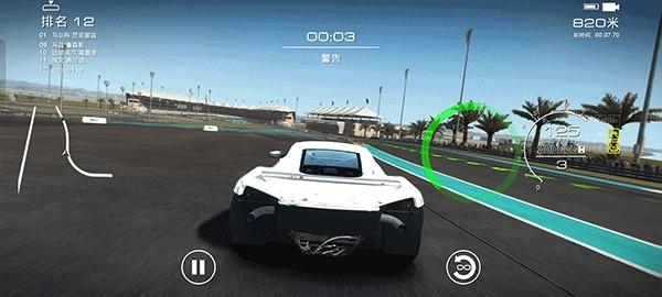 7、当321的倒计时归零,比赛就正式拉开序幕啦!你既可以用重力感应来调整方向,右边的按钮负责加速,左边的按钮则能实现刹车和漂移操作。