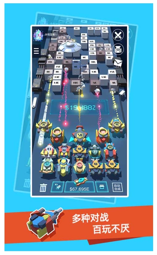 2、这款游戏融合了塔防与合并两种玩法元素,玩家可通过持续合成来升级炮塔,从而快速提升火力输出,消灭所有障碍物与敌人,助力轻松取胜。游戏还包含更多冒险内容,游玩过程不会感到无聊。