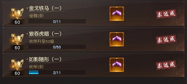 2、伙伴培养:玩家提升坐骑与伙伴的等级、阶级,即可达成成就并领取钻石奖励。