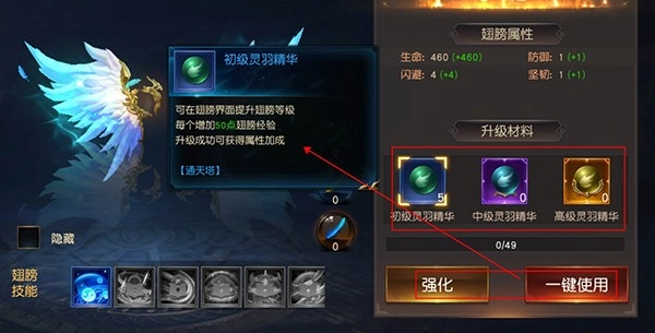 2、玩家也能利用升级材料对翅膀进行升级强化,以此提升翅膀的属性等级,进而增强属性加成效果。