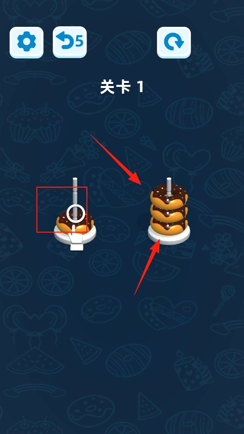 2、在关卡1中,存在两根插有甜甜圈的柱子,左侧柱子上放置着一个甜甜圈,右侧柱子上则有若干个堆叠起来的甜甜圈。我们需要将左侧柱子上的甜甜圈移动到右侧柱子上,使相同的甜甜圈能够堆叠在一起。