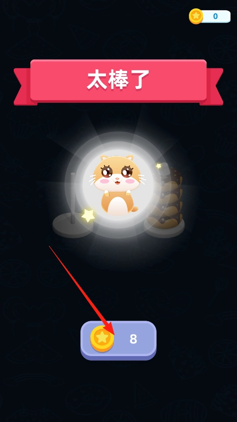 3、顺利通过关卡后,屏幕会弹出“太棒了”的提示语,还有萌萌的小动物图案,并且能得到8个金币作为奖励,这些金币可以先存起来,之后或许能用来解锁新的关卡内容或者游戏道具。