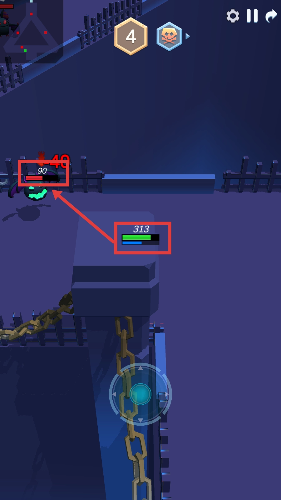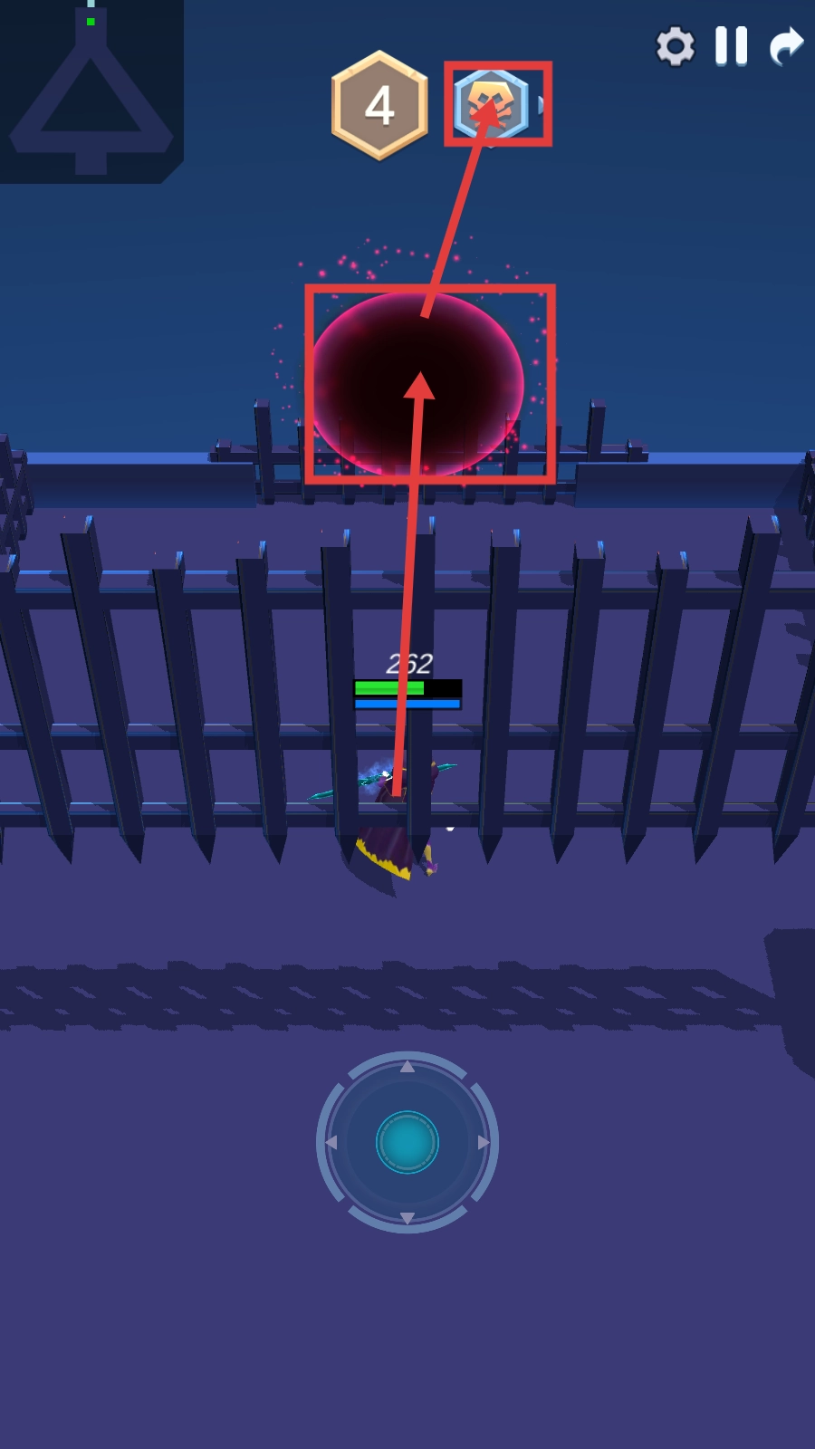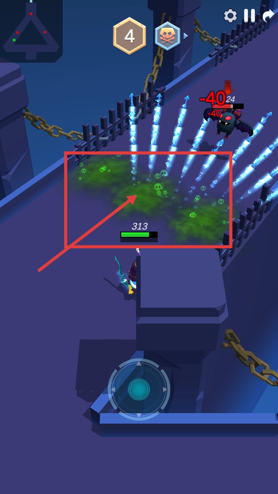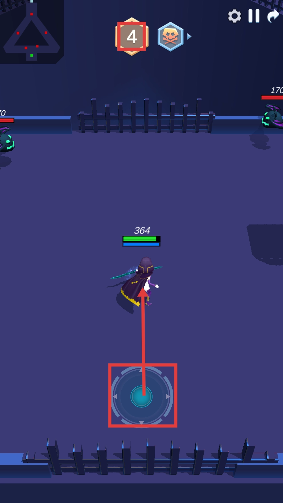 1、在【4】关战斗时,操控下方轮盘灵活移动,躲开两侧怪物的包抄,伺机发起攻击。