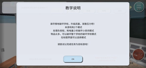 游戏内设有两种可体验的模式:一是破坏小房间模式,其处理负担较轻,耗电量也较少;二是破坏学校模式,该模式下物品丰富多样,能够对整个学校进行破坏。你可以根据自己的喜好随意选择。